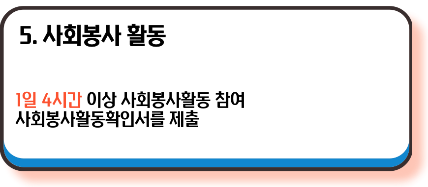 - 조건: 1일 4시간 이상 참여, 사회봉사활동확인서 제출