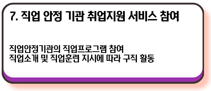 - 프로그램 참여: 직업안정기관에서 제공하는 직업프로그램에 참여합니다.