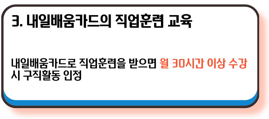 - 수강 조건: 내일배움카드를 통해 직업훈련을 받을 때, 월 30시간 이상 수강해야 합니다.