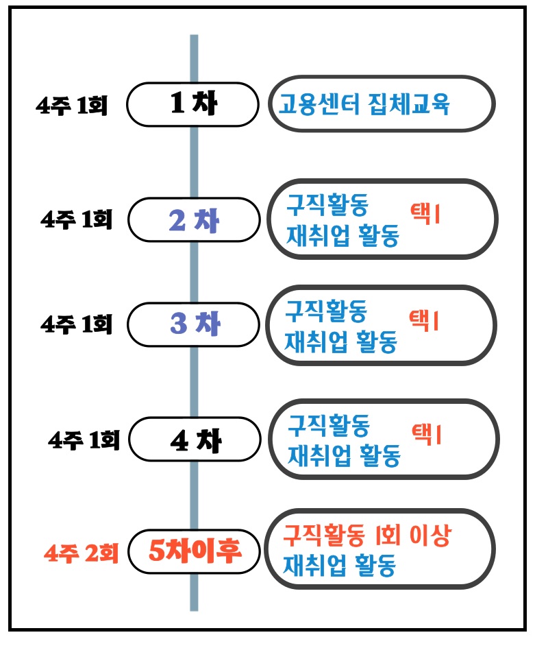 1차: 고용센터 집체교육 2차~4차: 재취업활동 혹은 구직활동(수급자 선택) 5차부터: 구직활동 1회 이상 반드시 포함 |