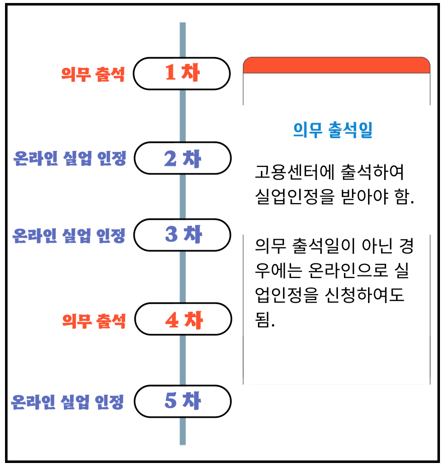 1. 의무 출석일: 수급자 유형별로 의무 출석일이 정하여져 있어 고용센터에 출석하여 실업인정을 받아야 합니다. 의무 출석일이 아닌 경우에는 온라인으로 실업인정을 신청할 수 있습니다.