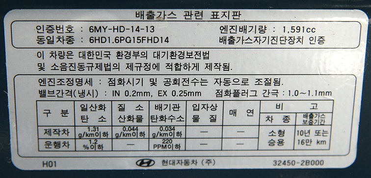 - 배출가스: 질소산화물(NOx) + 탄화수소(HC) 배출량: 1.8 g/km