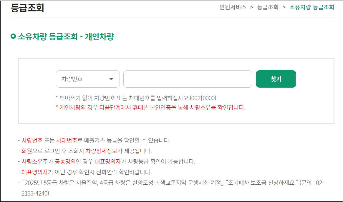 - 전화 조회: 1833-7435(자동차배출가스 종합전산시스템)에 전화를 걸어 차량 번호와 인적 사항을 제공하면 콜센터에서 배출가스 등급을 조회해 줍니다.