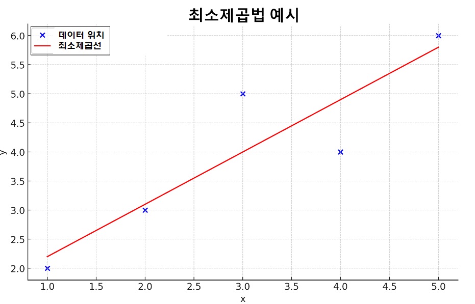 최소제곱법(Least Squares Method)을 사용한 간단한 예시를 들어보겠습니다. 이 방법은 주어진 데이터에 가장 잘 맞는 직선 또는 곡선을 찾는 데 사용됩니다. 아래는 임의의 데이터와 이를 기반으로 최소제곱법을 적용한 예시입니다. 데이터입니다.