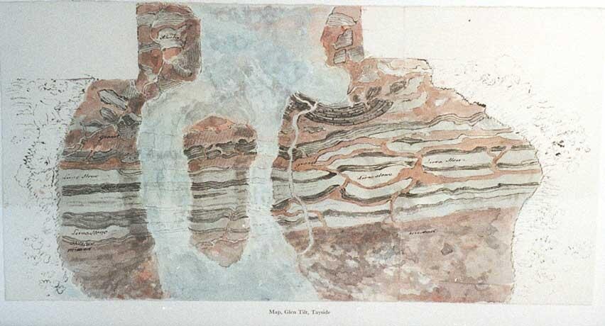 아래 그림은 지질학자 James Hutton이 그린 수채화의 복제품으로 제목은 Map, Glen Tilt, Tayside입니다. 출처는 USGS-575015입니다. 이 그림은 제임스 허턴의 글렌 틸트(Glen Tilt) 지질학적 노출부를 묘사한 것입니다. 이 그림을 통해 허턴의 지질학 이론, 특히 그의 플루턴론 이론을 설명할 수 있습니다.