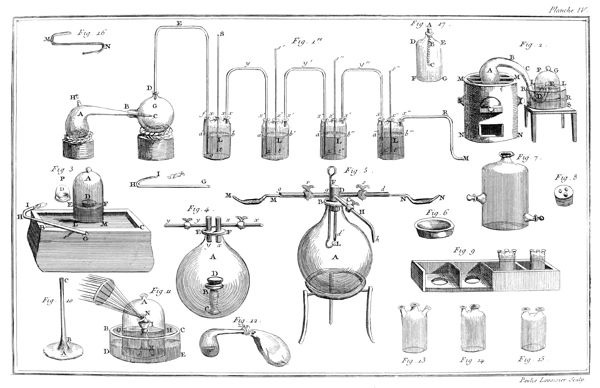 - Fig. 5 - Fig. 9: 기체 수집 용기. 여러 개의 연속된 기체 수집 용기들이 연결되어 있으며, 각 용기는 발생한 기체를 차례로 수집하여 분석할 수 있도록 설계되었습니다. 이는 Lavoisier가 다양한 기체를 분리하고 특성을 연구하는 데 사용한 중요한 방법입니다.