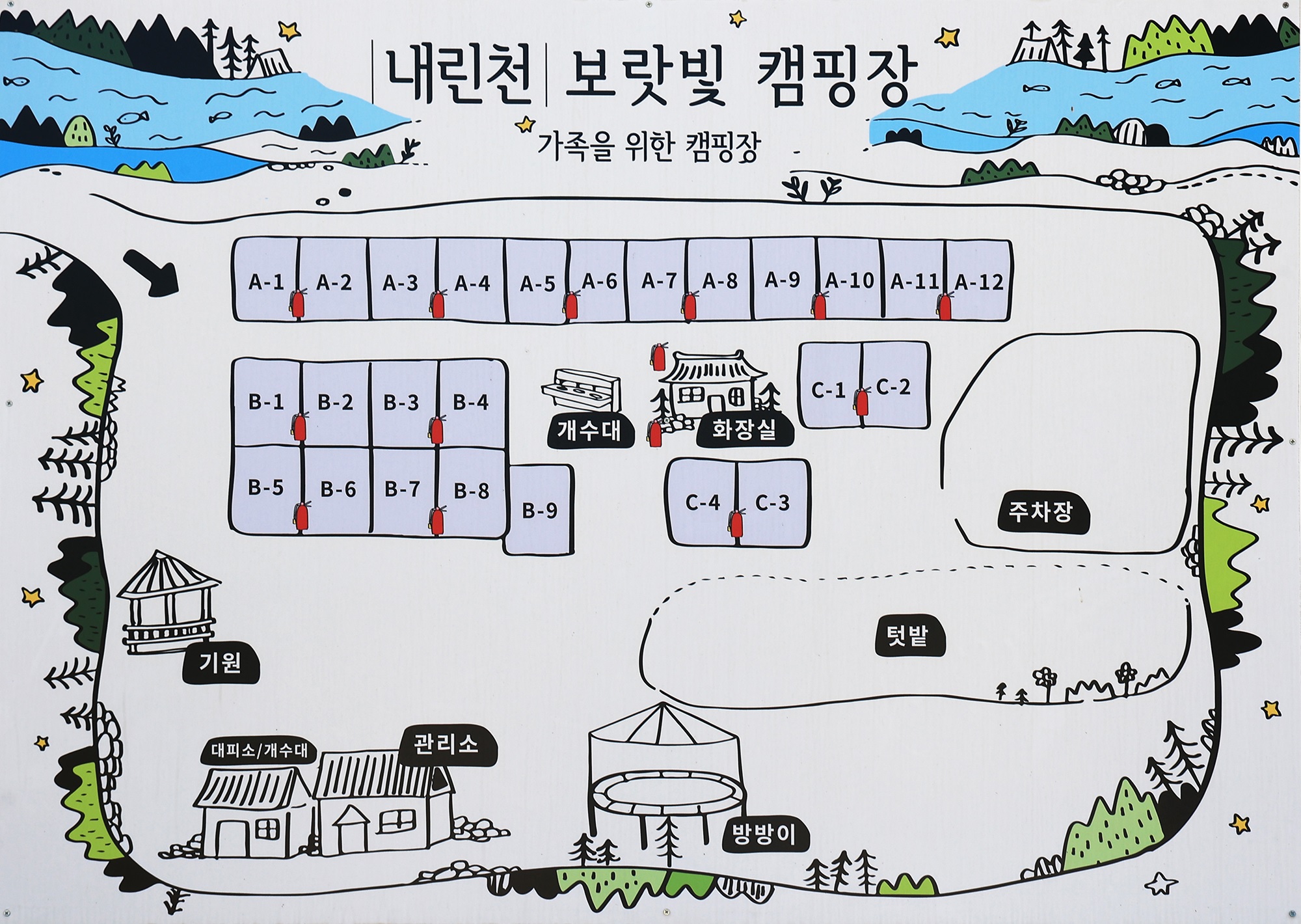 | 보랏빛 캠핑장은 인제의 내린천을 끼고 있는 캠핑장으로, 계곡과 주변 자연환경이 아름다워 가족 단위 캠핑에 최적화된 장소입니다. 옆에 흐르는 내린천은 넓고 얕아 아이들과 물놀이하기 좋습니다. 캠핑장은 총 25개의 사이트를 보유하고 있으며, 모든 사이트는 파쇄석 바닥입니다. 공용 시설이 편리하고 깨끗하게 관리되고 있어 쾌적한 캠핑을 즐길 수 있습니다. 사이트 간격이 넓고 나무가 잘 조성되어 있어 프라이버시를 보장합니다. 계곡 외에도 트램펄린과 인조 잔디가 있는 실외 놀이터가 있어 아이들이 즐겁게 놀 수 있는 공간을 제공합니다. 기본 정보