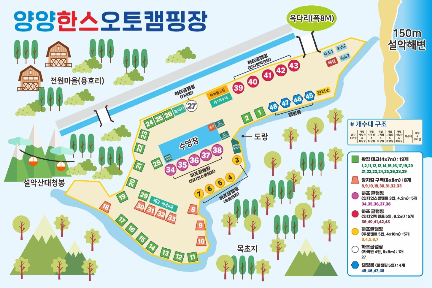 양양 한스오토캠핑장은 사계절 물놀이, 태닝, 서핑, 등산, 트레킹, 힐링이 가능한 캠핑장입니다. 설악해변까지 걸어서 1분 이내 거리며, 다양한 관광지와 먹거리가 가깝습니다. 캠핑장 내에는 수영장, 헬스장, 놀이터, 개인 샤워장 및 화장실, 습식 사우나 및 온탕, 반려견 수영장 등 다양한 편의시설이 마련되어 있습니다.기본 정보