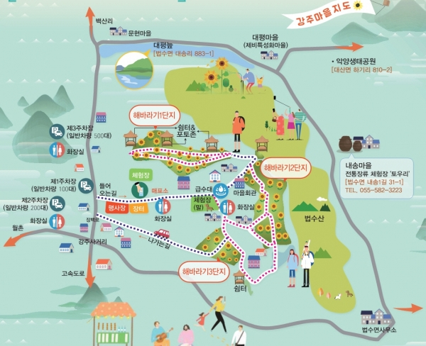 올해로 12회째를 맞이하는 강주 해바라기 축제는 전국에서 사진작가와 관광객들이 몰려드는 인기 명소입니다. 특히, 이번 축제 기간 동안 다양한 사진촬영 이벤트와 버스킹 공연이 마련되어 있어 방문객들의 많은 관심을 받고 있습니다. 축제를 위해 강주마을 주민들은 해바라기 단지의 토양 관리 및 종자 파종, 비닐 멀칭 작업 등을 통해 해바라기의 생장을 돕고 있습니다. 이 외에도 조망권 확보를 위한 대나무 굴취사업 등을 진행해 아름다운 해바라기 풍경을 조성하고 있습니다.