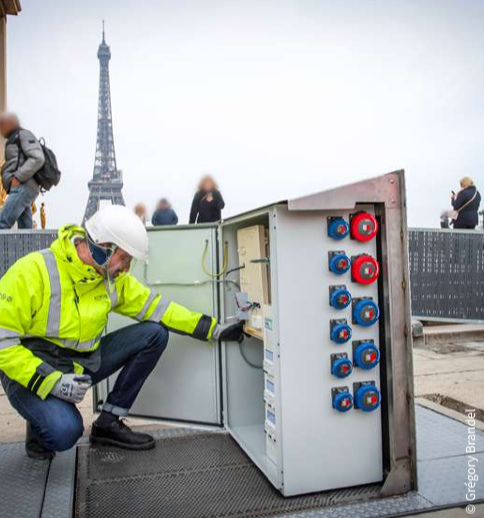 위 이미지는 에펠탑을 배경으로 파리 2024 올림픽의 에너지 관리 시스템을 점검하는 기술자의 모습을 보여줍니다. 이는 파리 2024 올림픽이 재생 가능 에너지를 사용하여 탄소 배출을 줄이기 위한 노력을 시각적으로 나타낸 것입니다. 즉, 독립 기관에서 발급한 공식 전자 증명서인 '기원 보증서'에 대한 설명입니다. 이 증명서는 최종 소비자에게 사용된 전력의 일정 비율이 재생 가능 에너지 형태로 전력망에 다시 공급되었음을 증명합니다.