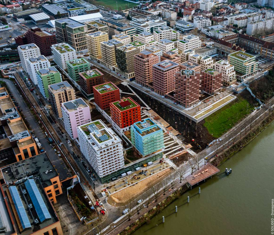 위 사진은 파리 2024 올림픽 선수촌과 경기장을 보여줍니다. 이 지역은 지속 가능한 건설 방법을 사용하여 지어졌으며, 탄소 배출을 줄이는 데 중점을 두었습니다. 건물들은 저탄소 콘크리트와 목재를 사용하여 지어졌으며, 경기장은 환경 친화적인 설계로 지어졌습니다. 이 이미지는 파리 2024의 지속 가능성 목표가 실제로 어떻게 구현되고 있는지를 시각적으로 보여줍니다.